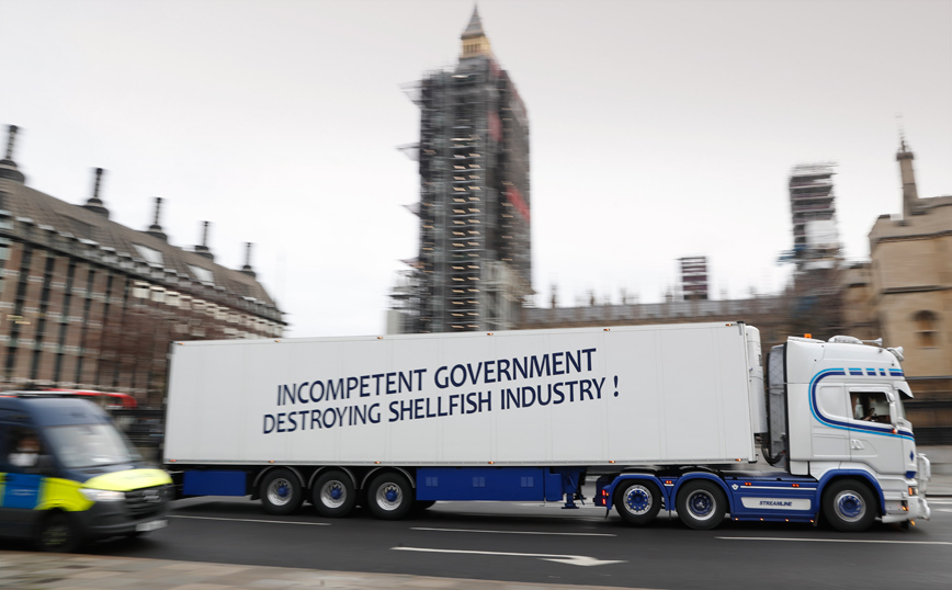 Τουλάχιστον δέκα φορτηγά μεταφοράς θαλασσινών έχουν παρκάρει στους δρόμους γύρω από τον αριθμό 10 της Ντάουνινγκ Στριτ και το βρετανικό κοινοβούλιο στο Λονδίνο.