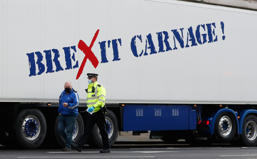 «Η Σφαγή του Brexit» είναι το σύνθημα επάνω σε φορτηγό που βρίσκεται παρκαρισμένο σε μικρή απόσταση από το πρωθυπουργικό γραφείο στην Ντάουνινγκ Στριτ μεταδίδει το ΑΠΕ-ΜΠΕ, επικαλούμενο το Reuters.
