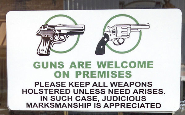 Πάντως ο πελάτης, με 75 δολάρια μπορεί να απολαύσει μαζί με το δείπνο του και ένα μάθημα σκοποβολής-όχι φυσικά μαγειρικής. Και ιδού γιατί: «Παρακαλώ κρατήστε όλα τα όπλα στη θήκη. Εκτός αν παραστεί ανάγκη. Σε τέτοια περίπτωση, η σωστή σκοπευτική δεινότητα είναι ευπρόσδεκτη», διαβάζει ο πελάτης σε πινακίδα πριν εισέλθει εντός του εστιατορίου. Πάντως, σίγουρα θα αποτελεί ρίσκο για κάποιον να διαμαρτυρηθεί για το μενού!