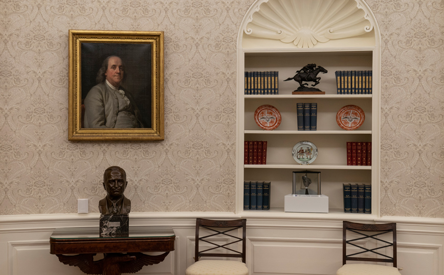 Ο Μπάιντεν έβγαλε την προτομή του παλιού προέδρου Άντριου Τζάκσον που είχε φέρει ο Τραμπ και την αντικατέστησε με το άγαλμα του Βενιαμίν Φραγκλίνου.