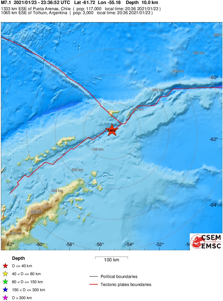 Η σεισμική δόνηση σημειώθηκε στις 20:36 (τοπική ώρα· 01:36 ώρα Ελλάδας) στη θάλασσα, περίπου 210 χιλιόμετρα ανατολικά από τη βάση αυτή, σε σχετικά μικρό βάθος 10 χιλιομέτρων, ανέφερε η εθνική υπηρεσία αντιμετώπισης εκτάκτων καταστάσεων (ONEMI), η οποία απηύθυνε σύσταση προς όλους να απομακρυνθούν από τις ακτές στην Ανταρκτική.