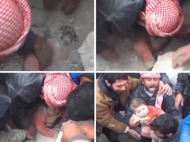 Ομάδα διασωστών που εργάζεται στο Χαλέπι σε μια ζώνη που ελέγχεται από τους Σύρους αντάρτες έδωσε σήμερα στη δημοσιότητα ένα συγκλονιστικό βίντεο με τη διάσωση ενός μωρού δύο μηνών από τα χαλάσματα, 16 ώρες μετά από έναν βομβαρδισμό.