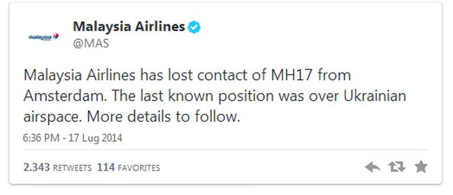 Η Malaysia Airlines μέσω twitter αναφέρει πως χάθηκε η επαφή με το αεροσκάφος της, που βρισκόταν πάνω από τον ουκρανικό εναέριο χώρο.