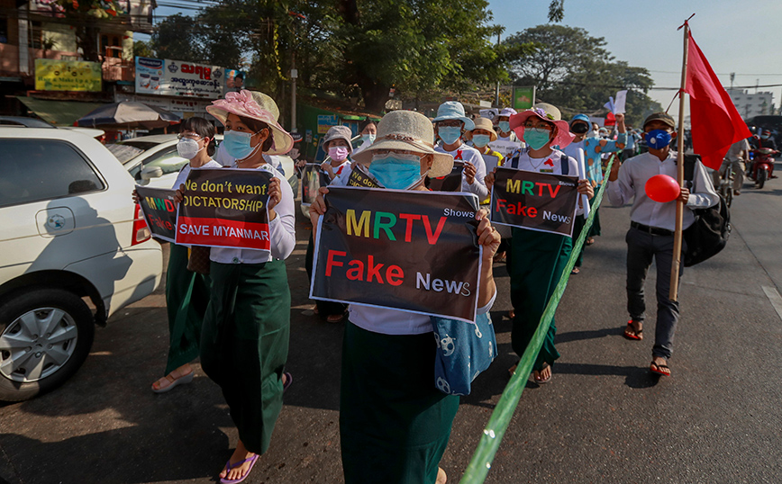 Αψηφώντας την απαγόρευση των συγκεντρώσεων, όπως μεταδίδει το Αθηναϊκό Πρακτορείο Ειδήσεων οι διαδηλωτές πορεύθηκαν ειρηνικά καταγγέλλοντας το πραξικόπημα της 1ης Φεβρουαρίου, που καταδικάσθηκε σε ολόκληρο τον κόσμο, ειδικότερα από την Ουάσινγκτον που επέβαλε νέες κυρώσεις κατά των βιρμανών στρατηγών.