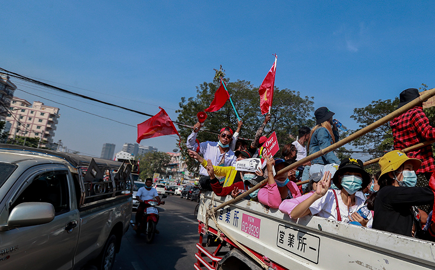 Στην Ρανγκούν, την οικονομική πρωτεύουσα της χώρας, ένα πλήθος γιατρών, ποδοσφαιριστών, φοιτητών, ιδιωτικών υπαλλήλων διαδήλωσε στις μεγάλες οδικές αρτηρίες της πόλης. «Δώστε μας πίσω την εκλεγμένη μας κυβέρνηση», «Σεβαστείτε την ψήφο μας», φώναζαν.