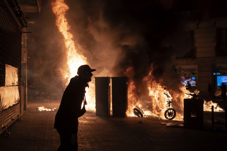 Οι διαδηλώσεις στην κεντρική πλατεία της πρωτεύουσας ήταν αρχικά ειρηνικές, με τους διαδηλωτές να χειροκροτούν ρυθμικά, φωνάζοντας συνθήματα όπως «Όχι άλλη αστυνομική βία» και «Ελευθερία στον Πάμπλο Χασέλ», τον ράπερ που συνελήφθη χθες στην καταλανική πόλη Λέριντα.