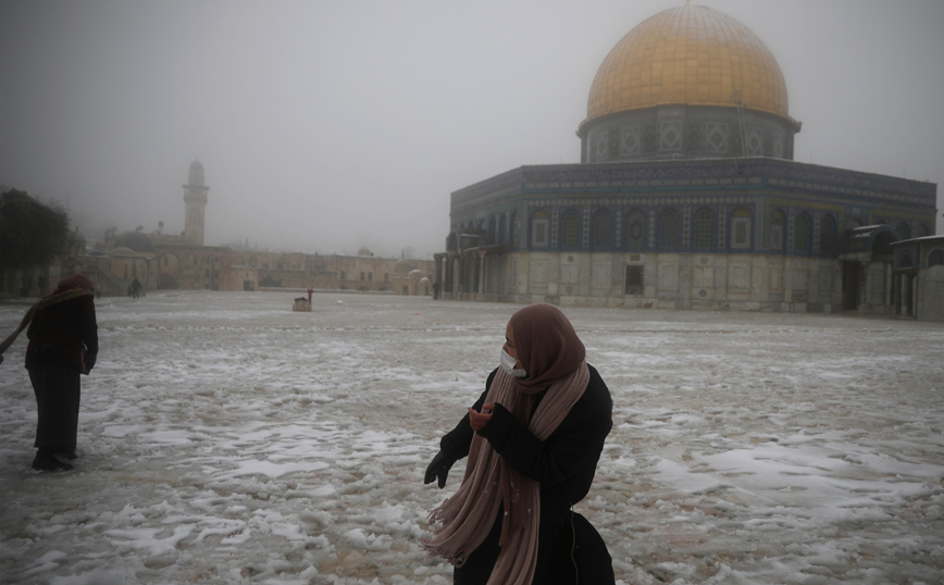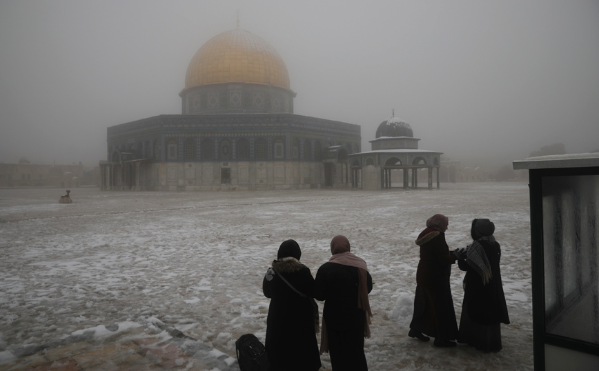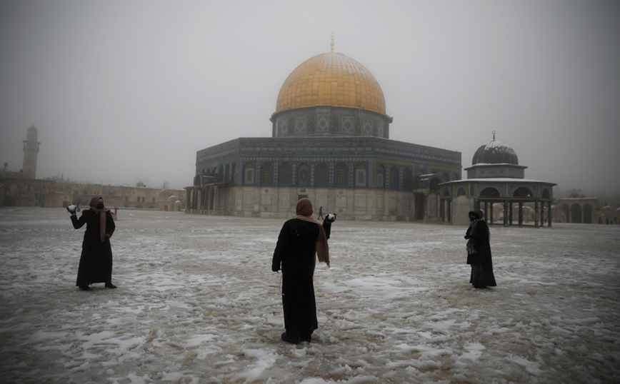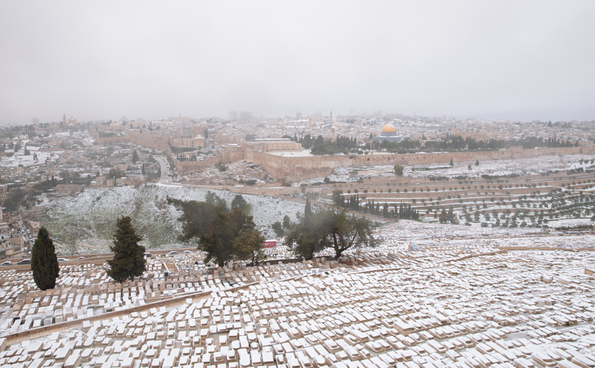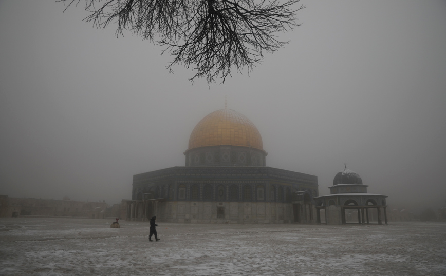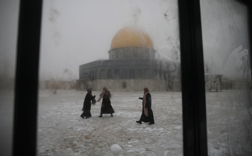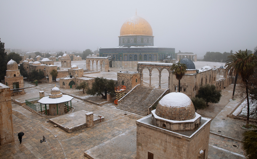 Μια σπάνια εικόνα αντίκρισαν οι κάτοικοι της Ιερουσαλήμ όταν ξύπνησαν την Πέμπτη. Τα πάντα είχαν καλυφθεί από χιόνι. Το Τείχος των Δακρύων και ο Θόλος του Βράχου είχαν ντυθεί στα λευκά εξαιτίας της χιονοθύελλας που ξέσπασε τη νύχτα.