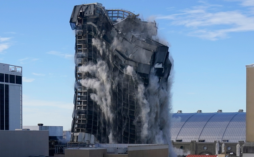 Ένα από τα παλαιότερα ξενοδοχεία-καζίνο του Ντόναλντ Τραμπ, στο Ατλάντικ Σίτι, μετατράπηκε την Τετάρτη σε έναν σωρό από συντρίμμια, μετά από ελεγχόμενη έκρηξη με 3.000 ράβδους δυναμίτη. Αυτό ήταν το πρώτο «παλάτι» του πρώην προέδρου των ΗΠΑ στην αυτοκρατορία των τυχερών παιγνίων στην ανατολική ακτή της χώρας. Σημαδιακό;…