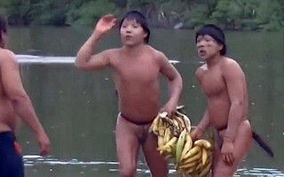 Τρεις άνδρες αρχικά εμφανίστηκαν στην άλλη όχθη του ποταμού. Οι κάτοικοι τους φώναξαν και για να τους δελεάσουν ένας από αυτούς άρχισε να επιδεικνύει δυο τσαμπιά με μπανάνες. Στην αρχή ήταν πολύ διστακτικοί αλλά στη συνέχεια πέρασαν το ποτάμι και πήραν τις μπανάνες.