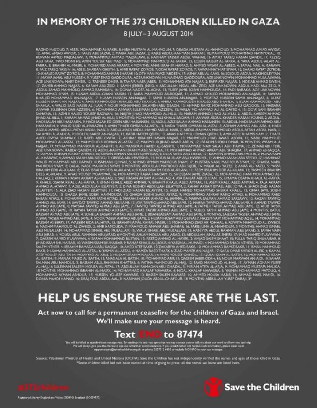 Στη δημοσιότητα έδωσε η φιλανθρωπική μη κυβερνητική οργάνωση «Save the Children» τα ονόματα εκατοντάδων παιδιών που σκοτώθηκαν στη Λωρίδα της Γάζας, με τη μορφή ολοσέλιδων καταχωρήσεων στα σημερινά φύλλα των βρετανικών εφημερίδων.