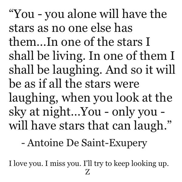 Το κείμενο γράφει: «Εσύ- εσύ μόνο θα έχεις τα αστέρια όπως κανένας άλλος δεν τα έχει. Σε ένα από αυτά θα ζω. Σε ένα από αυτά θα γελώ. Και έτσι όταν το βράδυ θα κοιτάς τον ουρανό θα είναι σαν όλα τα αστέρια να γελούν. Εσύ, μόνο εσύ θα έχεις τα αστέρια που μπορούν να γελούν.»