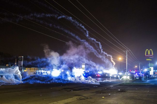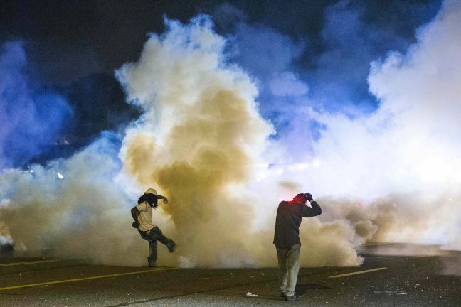 Σύμφωνα με το τηλεοπτικό δίκτυο KMOV-TV, οι αστυνομικοί που φορούσαν αλεξίσφαιρα γιλέκα, αντιασφυξιογόνες μάσκες και συνοδεύονταν από θωρακισμένα οχήματα, ανέλαβαν δράση μετά τη ρίψη κοκτέιλ μολότοφ προς την πλευρά των δυνάμεων της τάξης. ‘Αλλες πηγές έκαναν λόγο για πυροβολισμούς.