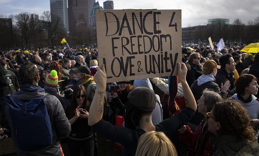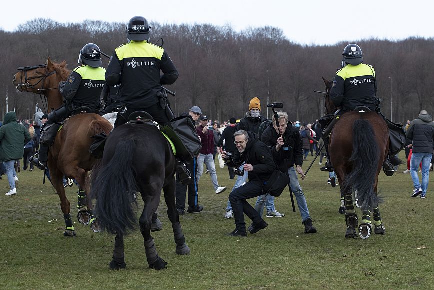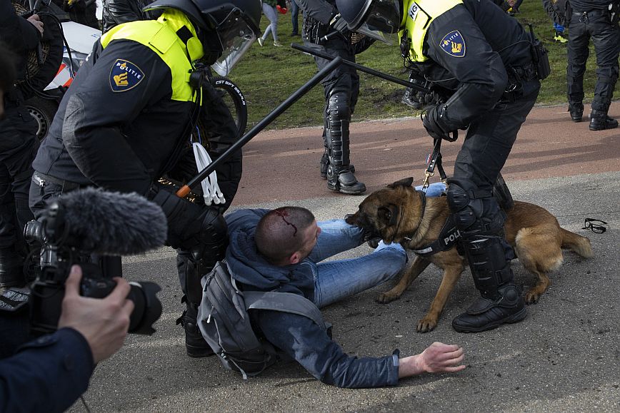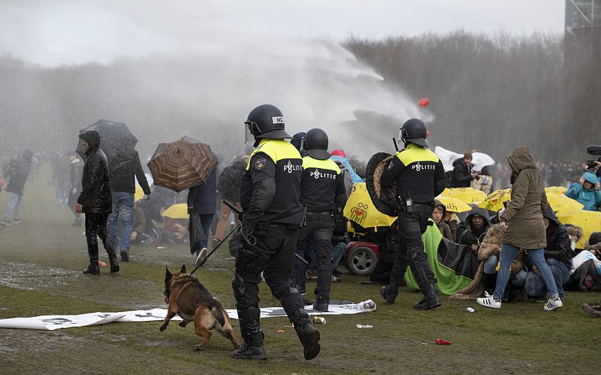 Εκτοξεύοντας νερό υπό πίεση και κάνοντας χρήση των γκλομπ τους, αστυνομικοί προσπάθησαν να διαλύσουν ένα πλήθος που είχε συγκεντρωθεί σήμερα στο κέντρο της Χάγης, μία ημέρα πριν από τις βουλευτικές εκλογές, για να διαμαρτυρηθεί για τα περιοριστικά μέτρα.