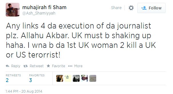«Δώστε μου link για την εκτέλεση του δημοσιογράφου. Ο Αλλάχ είναι μεγάλος. Η Βρετανία πρέπει να τρέμει από το φόβο της χαχαχα. Θέλω να είμαι η πρώτη βρετανίδα γυναίκα που να σκοτώσει έναν Βρετανό ή έναν Αμερικανό τρομοκράτη» σημείωσε χαρακτηριστικά η Χαντίτζα Ντέιρ από το νοτιοανατολικό Λονδίνο, που εκτιμάται ότι βρίσκεται στο βόρειο Ιράκ.