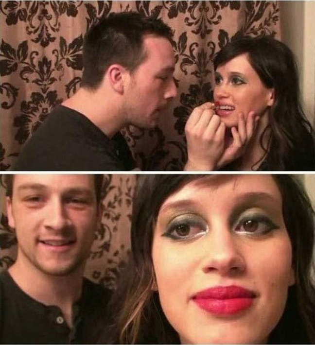 Τα αγόρια πήραν πινέλα και καλλυντικά και έπιασαν… δουλειά. Το παράδοξο είναι ότι οι σύντροφοι τους δέχθηκαν να δοκιμάσουν να γίνουν τα μοντέλα τους, χωρίς επιτυχία όμως. Το αποτέλεσμα σίγουρα δεν τις δικαίωσε, καθώς όσο και αν λέγεται ότι οι άνδρες προτιμούν να βλέπουν τις γυναίκες διακριτικά μακιγιαρισμένες, οι συγκεκριμένες περισσότερο έμοιαζαν με αποτελέσματα… ατυχήματος.