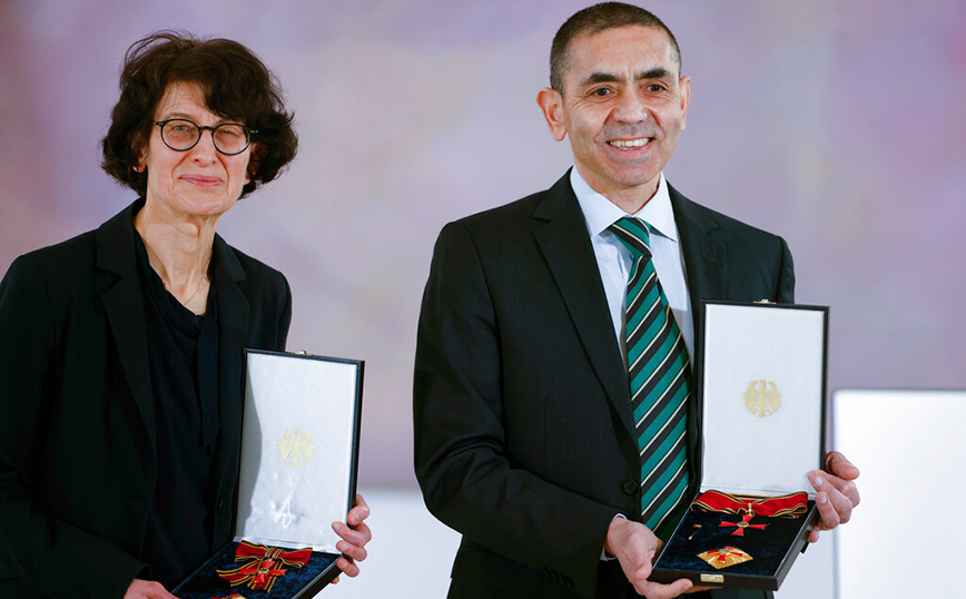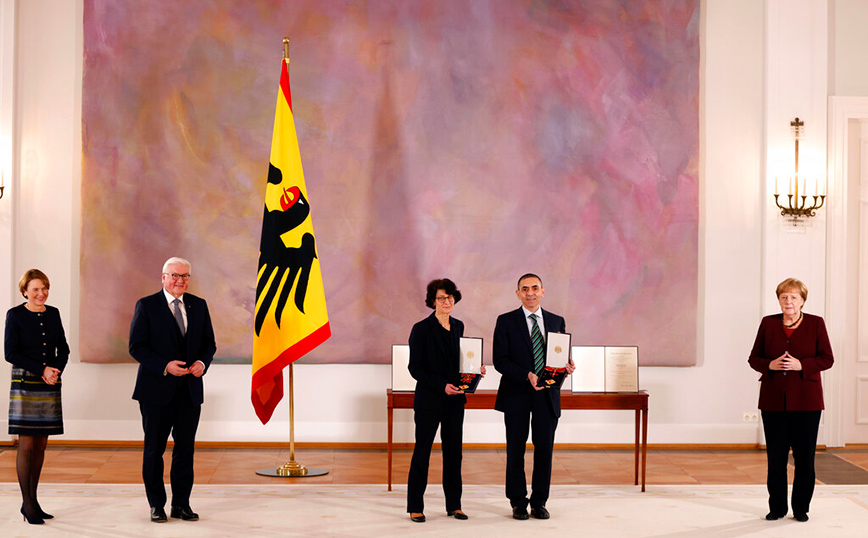 Οι ιδρυτές της εταιρίας BioNTech Εζλέμ Τουρετσί και Ουγούρ Σαχίν ήταν εκείνοι που δημιούργησαν το πρώτο εμβόλιο κατά της Covid-19. Ο πρόεδρος της Γερμανίας Φρανκ-Βάλτερ Σταϊνμάιερ, παρουσία της καγκελαρίου Άνγκελα Μέρκελ, τίμησε σήμερα τους δύο επιστήμονες με τον Μεγαλόσταυρο του Τάγματος της Αξίας της Ομοσπονδιακής Δημοκρατίας της Γερμανίας.