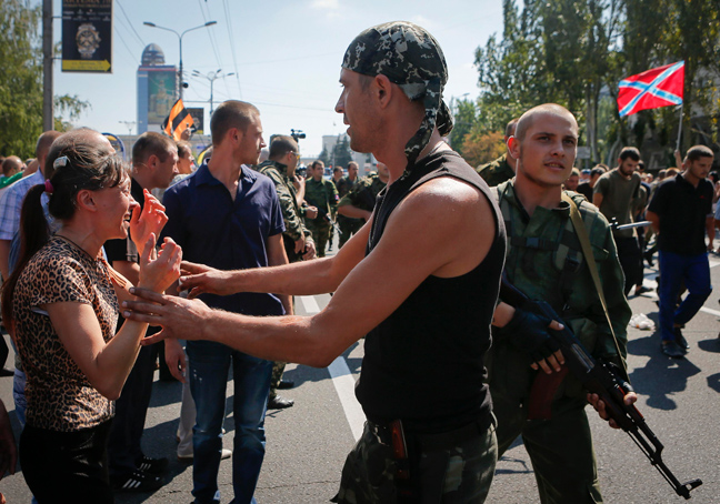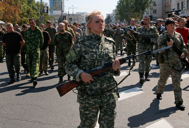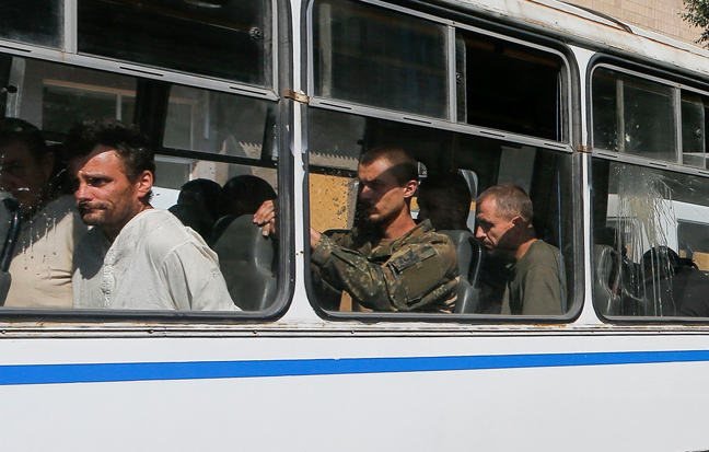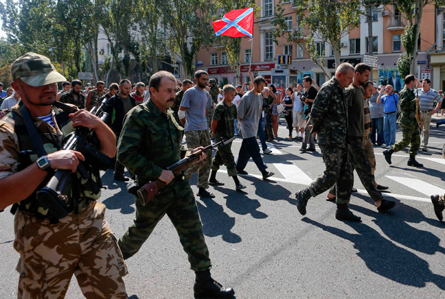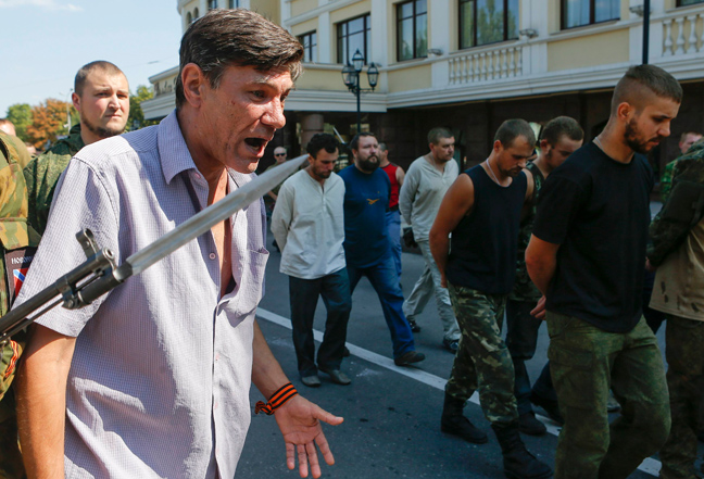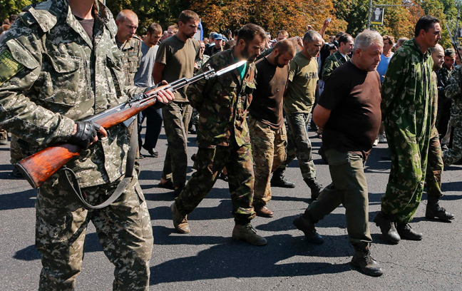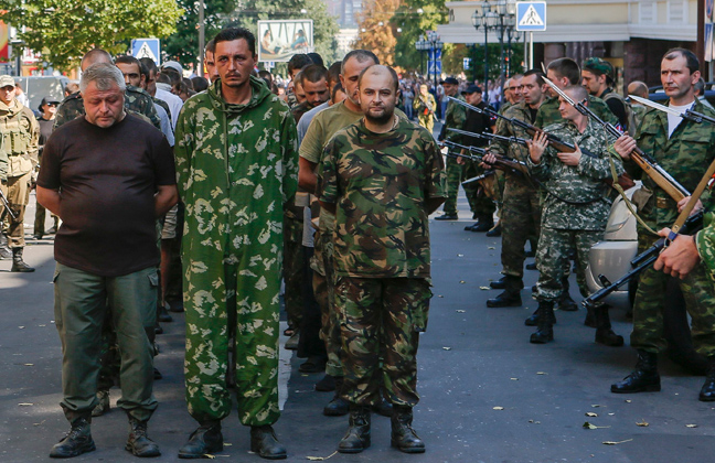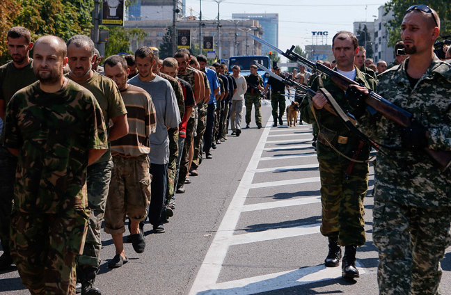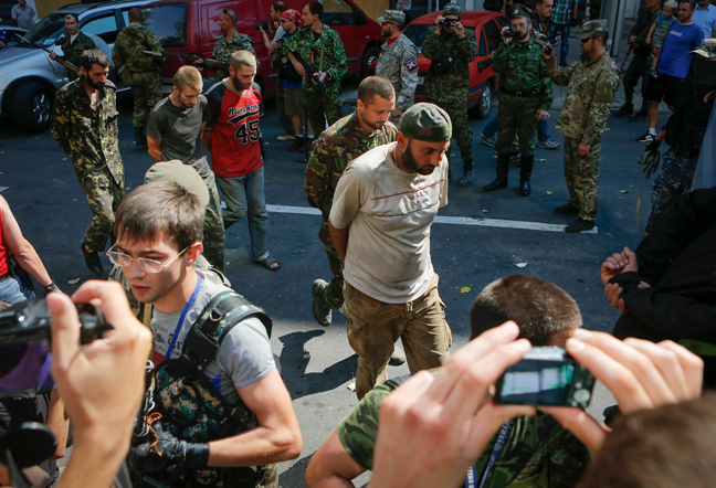 Ήταν αξύριστοι, βρώμικοι, κάποιοι φορούσαν στολές μάχης και άλλοι πολιτικά ρούχα και περπατούσαν με δεμένα τα χέρια και σκυμμένα τα κεφάλια, την ώρα που τους φρουρούσαν οι αυτονομιστές με καλάζνικοφ στα χέρια. Παράλληλα, ο κόσμος φώναζε «φασίστες» προς τους περίπου 40 με 50 αιχμαλώτους, οι οποίοι συγκεντρώθηκαν στην πλατεία Λένιν.