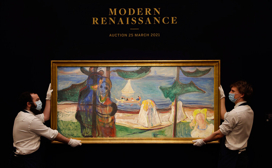 Η δημοπρασία που τιτλοφορείται «Σύγχρονη Αναγέννηση» είναι προγραμματισμένη για τις 25 Μαρτίου, όπως αναφέρει το ΑΠΕ-ΜΠΕ. Στα προς πώληση έργα είναι και το «Φιλί στην παραλία» (1904) του Μουνκ που εκτιμάται ότι θα πιάσει 9-12 εκατομμύρια λίρες (περίπου 12-16 εκατομμύρια ευρώ).