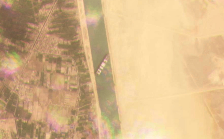 Το Ever Given βρίσκεται πλέον παράλληλα με την όχθη του καναλιού. Προηγουμένως το πλοίο βρισκόταν σε διαγώνια θέση αποκλείοντας την διέλευση.