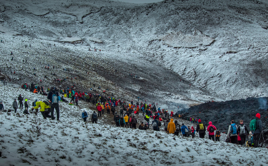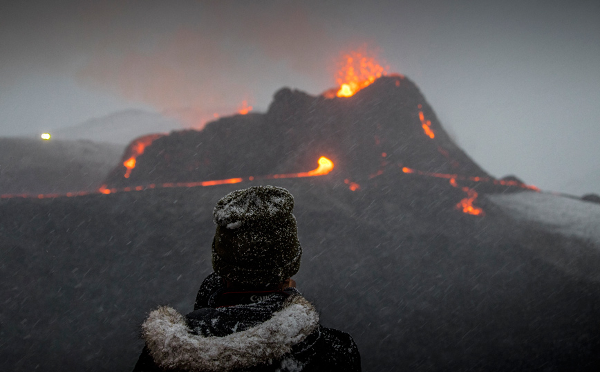 Πολύ διαφορετικές σε σχέση με της Αίτνας δεν είναι και οι εικόνες που έρχονται από το ηφαίστειο Φάγκρανταλσφιαλ κοντά στο Ρέικιαβικ. Η λάβα έσπασε μια ρωγμή στον φλοιό της Γης μήκους εκατοντάδων μέτρων και μια σειρά από μικρά σιντριβάνια έβαψαν πορτοκαλί τον νυχτερινό ουρανό της Ισλανδίας, ενώ αρκετός κόσμος έσπευσε να δει τον «γίγαντα» αυτό από κοντά.