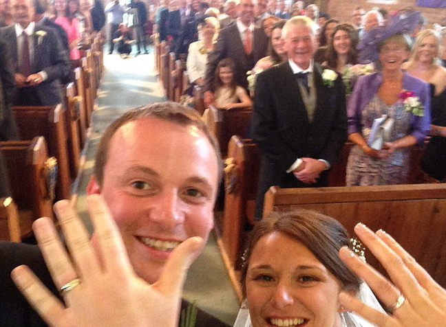 Ο Andrew ελάχιστα δευτερόλεπτα αφότου φόρεσε τη βέρα άρπαξε το iPhone του κουμπάρου του κι έβγαλε selfie με τη σύζυγό του Sally με τους συγγενείς και φίλους να τους παρακολουθούν έκπληκτοι.