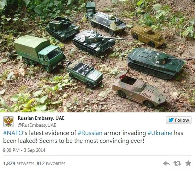 Μέσω twiiter ο λογαριασμός @RussEmbassyUAE «πόσταρε» φωτογραφία με τανκς… πλαστικά παιχνίδια και προσέθεσε το σχόλιο: Τα πιο πειστικά αποδεικτικά στοιχεία του NATO για την εισβολή Ρώσων στρατιωτών στην Ουκρανία».