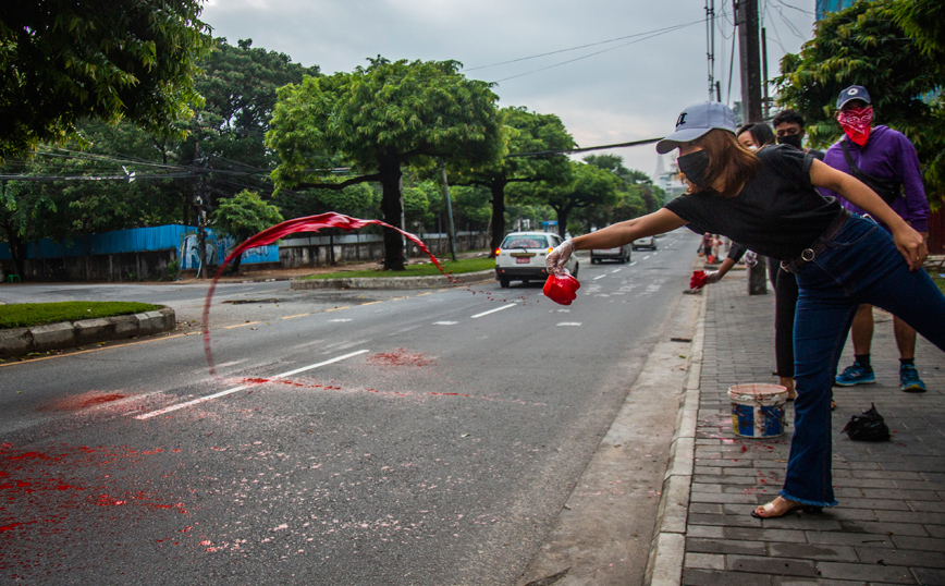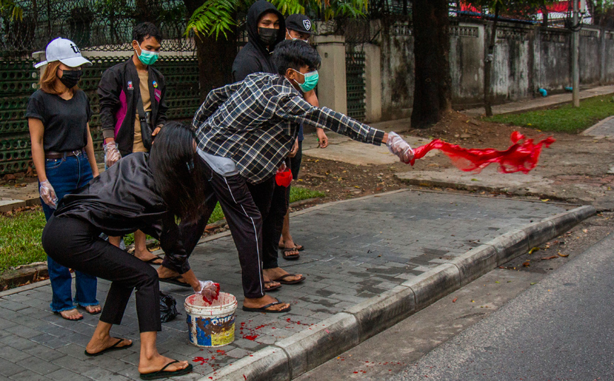 Με κόκκινη μπογιά έβαψαν αντίπαλοι της χούντας στη Μιανμάρ δρόμους, πεζοδρόμια και στάσεις λεωφορείων στη Ρανγκούν προς τιμή των εκατοντάδων «μαρτύρων» που έχει σκοτώσει ο στρατός στη διάρκεια της καταστολής των διαδηλώσεων.