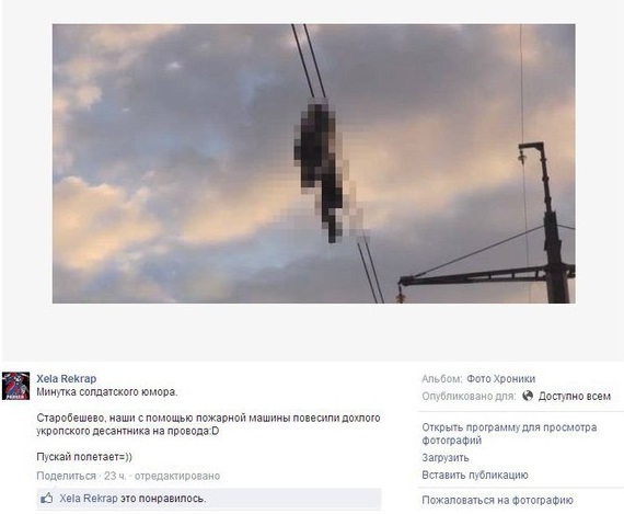 Σοκ και αποτροπιασμό σε μεγάλο μέρος της κοινότητας του Facebook προκάλεσε η ανάρτηση φωτογραφίας με κρεμασμένο ουκρανό στρατιώτη, που έγινε στις 4 Σεπτεμβρίου από τον χρήστη με το όνομα «Ξέλα Ρεκραπ».