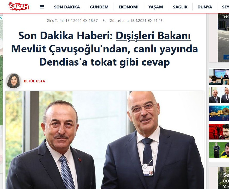 Το δημοσίευμα αναφέρει ότι «Ο υπουργός Εξωτερικών Μεβλούτ Τσαβούσογλου έκανε κοινή δήλωση με τον Έλληνα υπουργό Εξωτερικών Νίκο Δένδια. Μετά τις δηλώσεις του Δένδοια, ο υπουργός Τσαβούσογλου αντέδρασε και είπε: “Δεν κατηγόρησα την Ελλάδα στην ομιλία μου. Ο Νίκος Δένδιας δυστυχώς εξαπέλυσε εξαιρετικά απαράδεκτες κατηγορίες κατά της χώρας μου. Μίλησε για τα κυριαρχικά δικαιώματα της Ελλάδας, δεν είναι δυνατόν να το αποδεχθώ”».