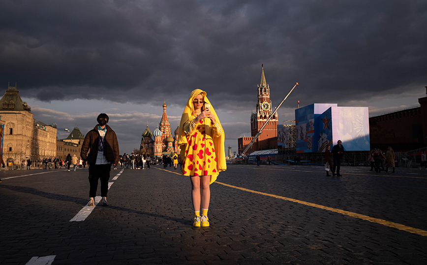 Η εικόνα με τη νεαρή κοπέλα να βγάζει selfie με φόντο την κόκκινη πλατεία και έναν μασκοφορεμένο άνδρα πίσω της μοιάζει σουρεάλ. Όμως, το κεντρικό αυτό σημείο της Μόσχας ελκύει αρκετό κόσμο αυτό το διάστημα, καθώς εντείνονται οι προετοιμασίες για την εκδήλωση της συμπλήρωσης 76 ετών από την Ημέρα της Νίκης (9 Μαΐου) στον Β’ Παγκόσμιο Πόλεμο.