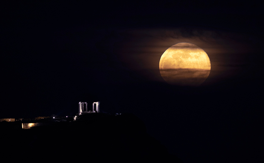 Σούνιο, Ελλάδα: Η ροζ πανσέληνος «έπαιξε» όμορφα με τα σύννεφα