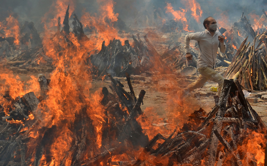 Αυτήν την ώρα το υγειονομικό σύστημα της Ινδίας καταρρέει υπό το βάρος των ασθενών με COVID-19 και τα νοσοκομεία αντιμετωπίζουν έλλειψη κλινών και ιατρικού οξυγόνου. Τα νεκροτομεία και τα αποτεφρωτήρια δεν μπορούν πλέον να χειριστούν τον υψηλό αριθμό των νεκρών, για την καύση των οποίων στήνονται πλέον αυτοσχέδιες πυρές σε πάρκα και χώρους στάθμευσης.