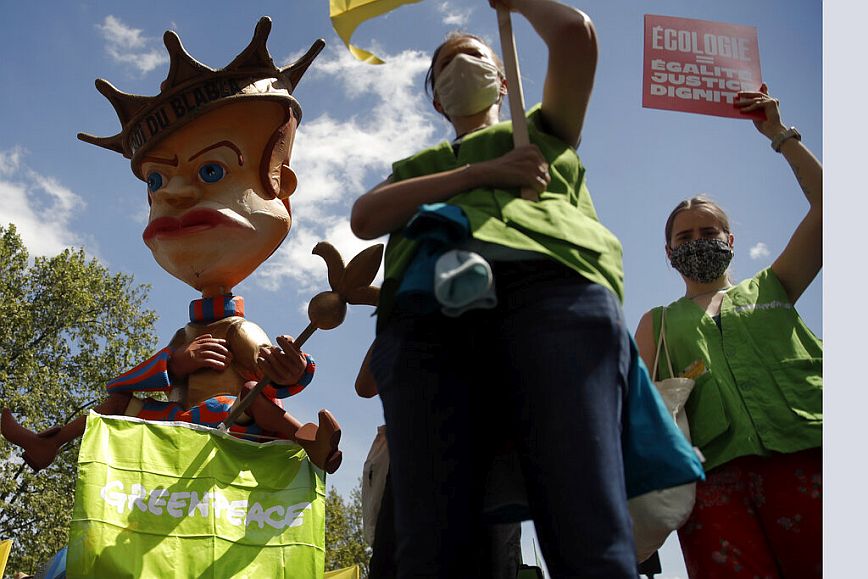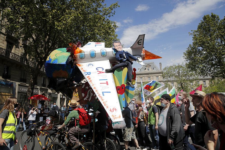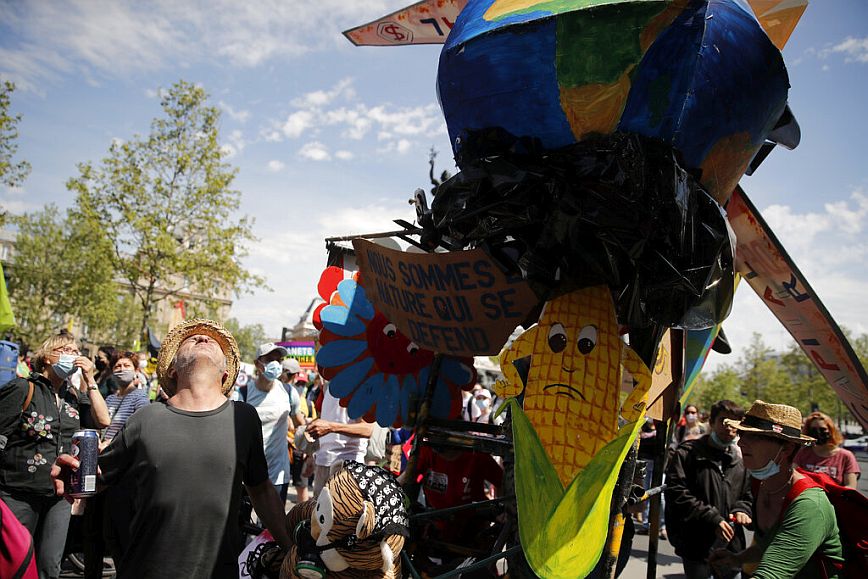 Οι διαδηλωτές, συγκεντρωμένοι πίσω από ένα πανό που έγραφε “Νόμος για το κλίμα = αποτυχία της πενταετούς θητείας”, πραγματοποίησαν πορεία ανάμεσα στην πλατεία Δημοκρατίας και την πλατεία της Βαστίλης στην πρωτεύουσα.