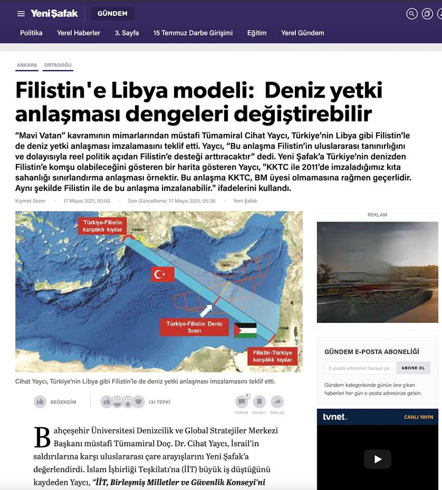 Να υπογραφεί συμφωνία που θα καθορίζει… κοινά θαλάσσια σύνορα μεταξύ Τουρκίας και Παλαιστίνης ζητά από την κυβέρνηση Ερντογάν ο θεωρητικός της επονομαζόμενης «Γαλάζιας Πατρίδας», απόστρατος αντιναύαρχος Τζιχάτ Γιαϊτζί, αγνοώντας επιδεικτικά την Αποκλειστική Οικονομική Ζώνη της Κυπριακής Δημοκρατίας που είχαν σαν να μην υπάρχει γι΄ αυτόν.
