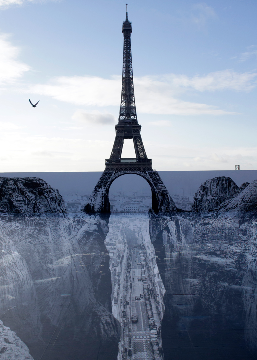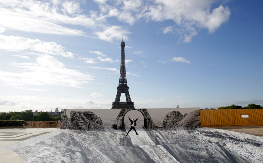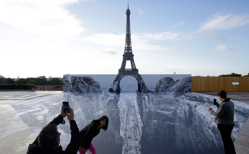 Το έργο τέχνης, από έναν καλλιτέχνη που χρησιμοποιεί το ψευδώνυμο JR, περιλαμβάνει την εγκατάσταση μιας φωτογραφίας ενός φαραγγιού και τους πυλώνες που σχηματίζουν τη βάση του Πύργου του Άιφελ, πάνω στην πλατεία όπου δεσπόζει το διάσημο αξιοθέατο.