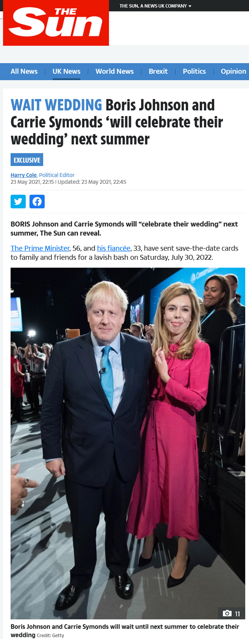 Με τα δεσμά του γάμου θα ενωθούν τον Ιούλιο του 2022 ο Βρετανός πρωθυπουργός Μπόρις Τζόνσον και η μνηστή του Κάρι Σίμοντς.