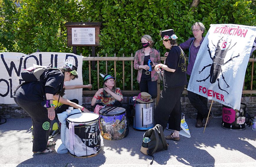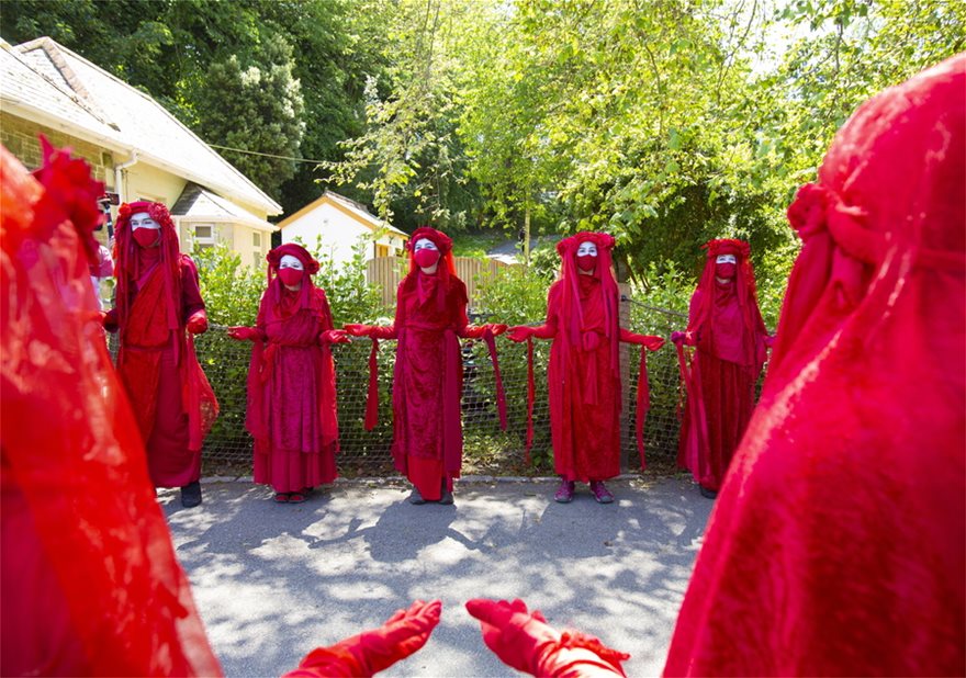 Ακτιβιστές φορώντας μάσκες, ντυμένοι στα κόκκινα, έκαναν πορεία με τύμπανα, που διοργάνωσε η οργάνωση Extinction Rebellion, περίπου 35 χιλιόμετρα από τον τόπο της Συνόδου, στην πόλη που φιλοξενείται το κέντρο Τύπου.
