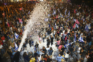 Ένα περιχαρές πλήθος γέμισε την πλατεία Ράμπιν, στο κέντρο του Τελ-Αβίβ, για να γιορτάσει την αλλαγή της κυβέρνησης που επικυρώθηκε σήμερα από το Κοινοβούλιο με μικρή πλειοψηφία 60 βουλευτών υπέρ του νέου συνασπισμού, έναντι 59 που καταψήφισαν.
