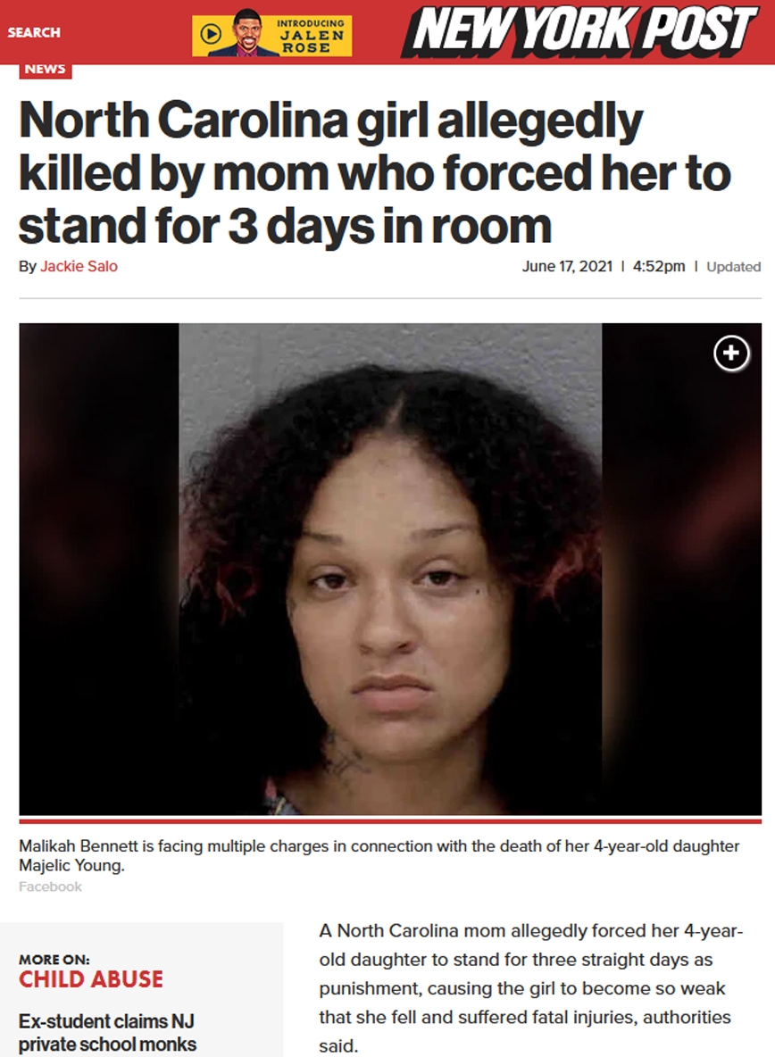 Η 31χρονη από την Βόρεια Καρολίνα στις ΗΠΑ, κατηγορείται για τη δολοφονία της 4χρονης Majelic, αλλά και για κακοποίηση ανηλίκου.