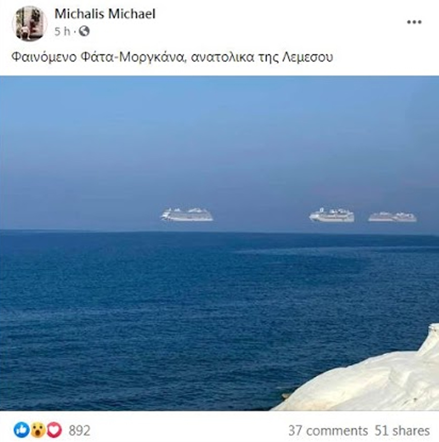 Πρόκειται για μια οφθαλμαπάτη, για το φαινόμενο Φάτα Μοργκάνα, το οποίο απεικονίζεται στη φωτογραφία που δημοσιεύθηκε στη σελίδα του Facebook Καιρόφιλοι Κύπρου.