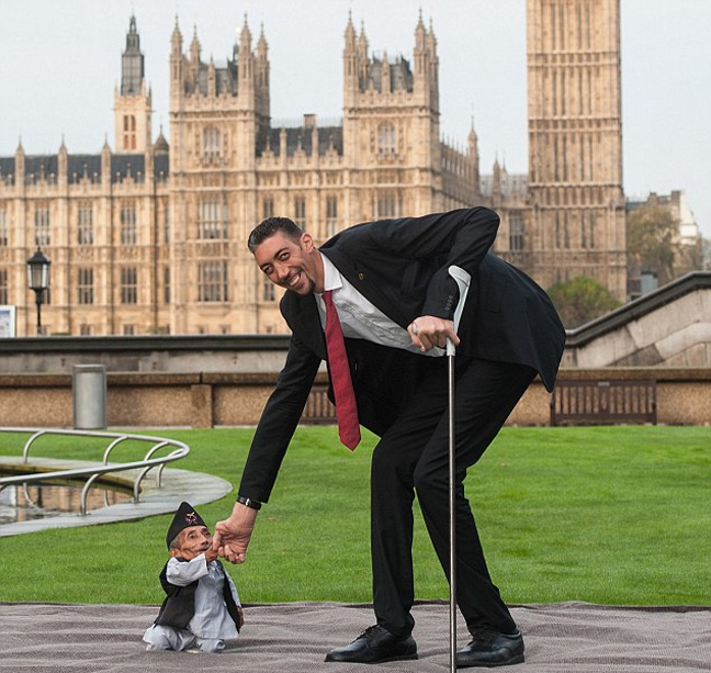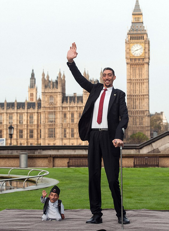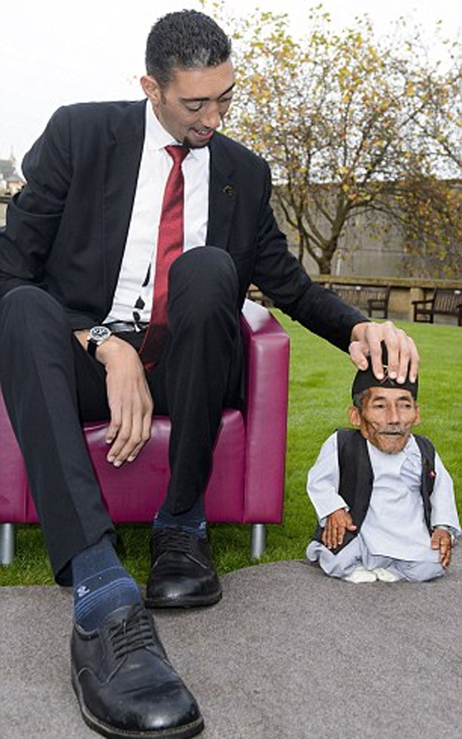 O ένας βλέπει τον κόσμο από τα 2,51 μέτρα, ο άλλος δεν έχει ύψος παρά μόλις 54,6 εκατοστά: ο ψηλότερος άνδρας του κόσμου, ο Τούρκος Σουλτάν Κιοσέν, συνάντησε σήμερα στο Λονδίνο για πρώτη φορά τον κοντύτερο άνδρα παγκοσμίως, τον Τσάντρα Μπαχαντούρ Ντάνγκι από το Νεπάλ.