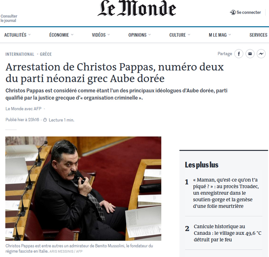 Ο Χρήστος Παππάς θεωρείται ένας από τους κύριους ιδεολόγους της Χρυσής Αυγής, ένα κόμμα που χαρακτηρίζεται από την ελληνική δικαιοσύνη ως “εγκληματική οργάνωση”» υπογραμμίζει σε άρθρο της η Le Monde.