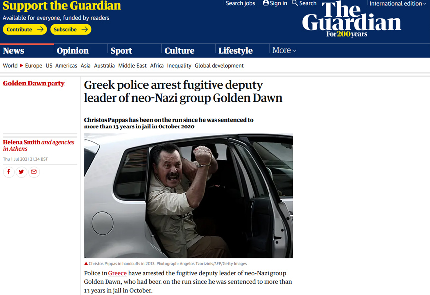 Σε άρθρο του ο Guardian σημειώνει ότι «η ελληνική αστυνομία συλλαμβάνει τον φυγόποινο αναπληρωτή ηγέτη της νεοναζιστικής ομάδας Χρυσή Αυγή» συμπληρώνοντας ότι «ο Χρήστος Παππάς είχε διαφύγει από τότε που καταδικάστηκε σε ποινή φυλάκισης άνω των 13 ετών τον Οκτώβριο του 2020».