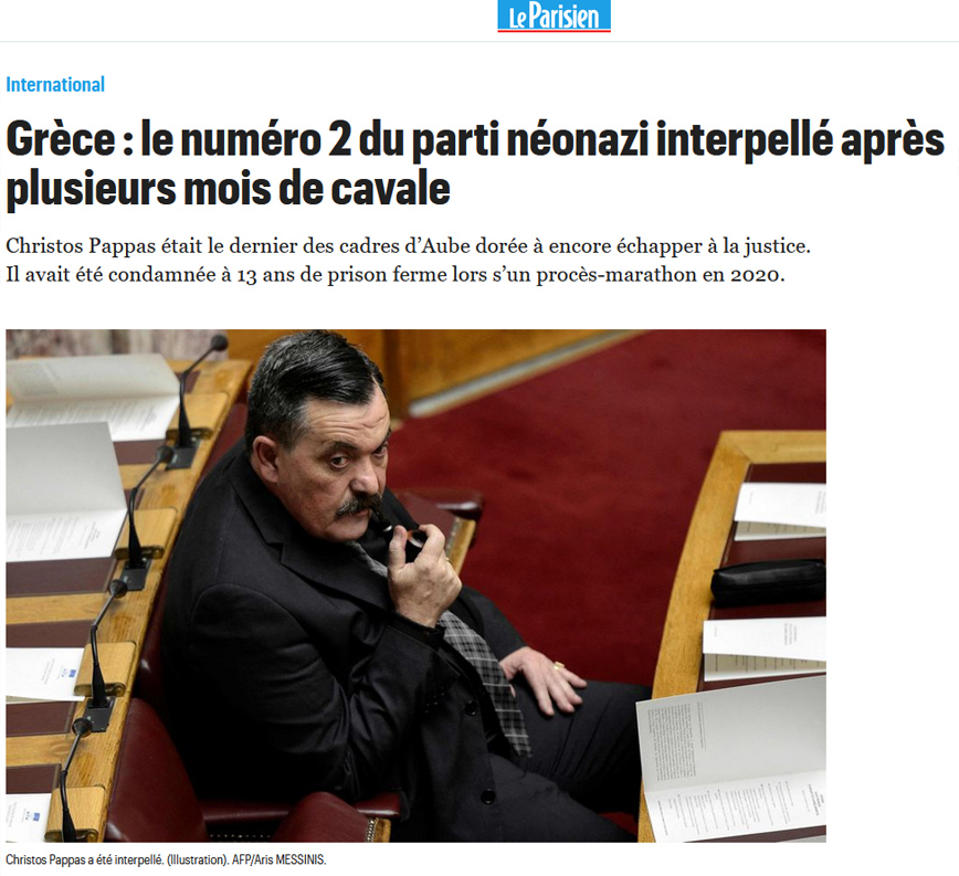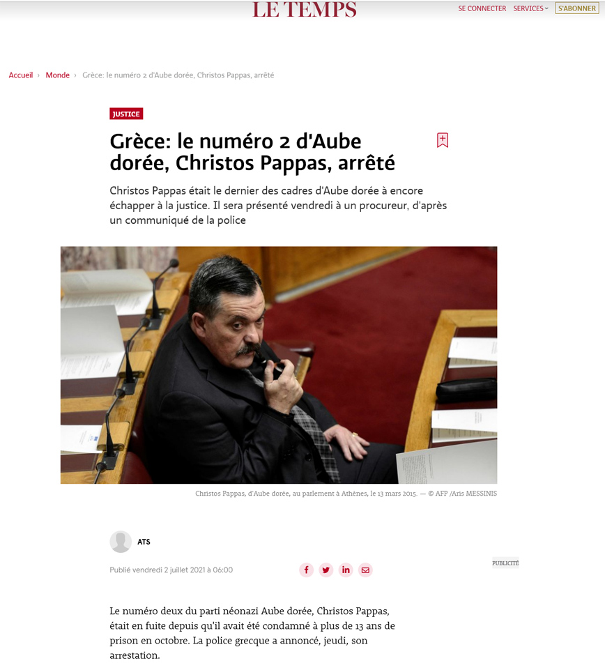 Το γαλλικό Le Temps γράφει σε άρθρο πως συνελήφθη στην Ελλάδα το νούμερο 2 της Χρυσής Αυγής σημειώνοντας πως «ήταν ο τελευταίος από τα στελέχη της Χρυσής Αυγής που διέφευγε».