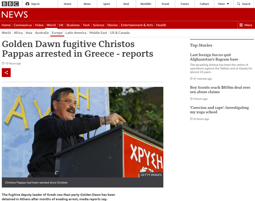 «Ο φυγόδικος της Χρυσής Αυγής Χρήστος Παππάς συνελήφθη στην Ελλάδα» είναι ο τίτλος δημοσιεύματος του BBC, στο οποίο αναφέρεται ότι ο «φυγάς υπαρχηγός του ελληνικού νεοναζιστικού κόμματος Χρυσή Αυγή τέθηκε υπό κράτηση στην Αθήνα μετά από μήνες που διέφευγε της σύλληψης».