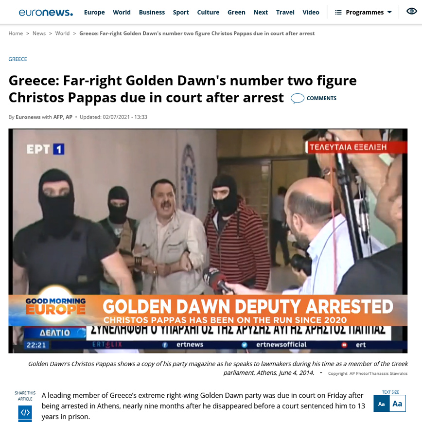 «Συνελήφθη ο Χρήστος Παππάς, νούμερο δύο του ελληνικού νεοναζιστικού κόμματος Χρυσή Αυγή.