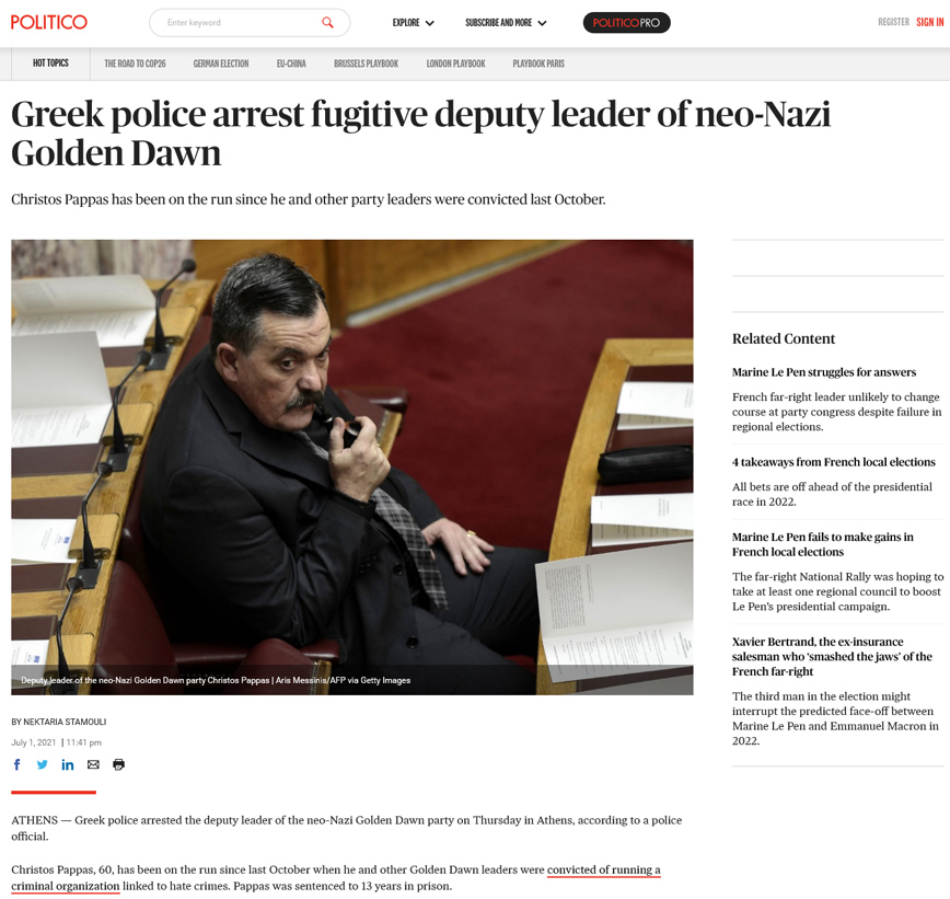 To Politico αναφέρει πως συνελήφθη ο υπαρχηγός της νεοναζιστικής Χρυσής Αυγής, ο οποίος ήταν φυγόποινος από τον περασμένο Οκτώβριο όταν τα υπόλοιπα μέλη της οργάνωσης είχαν καταδικαστεί.