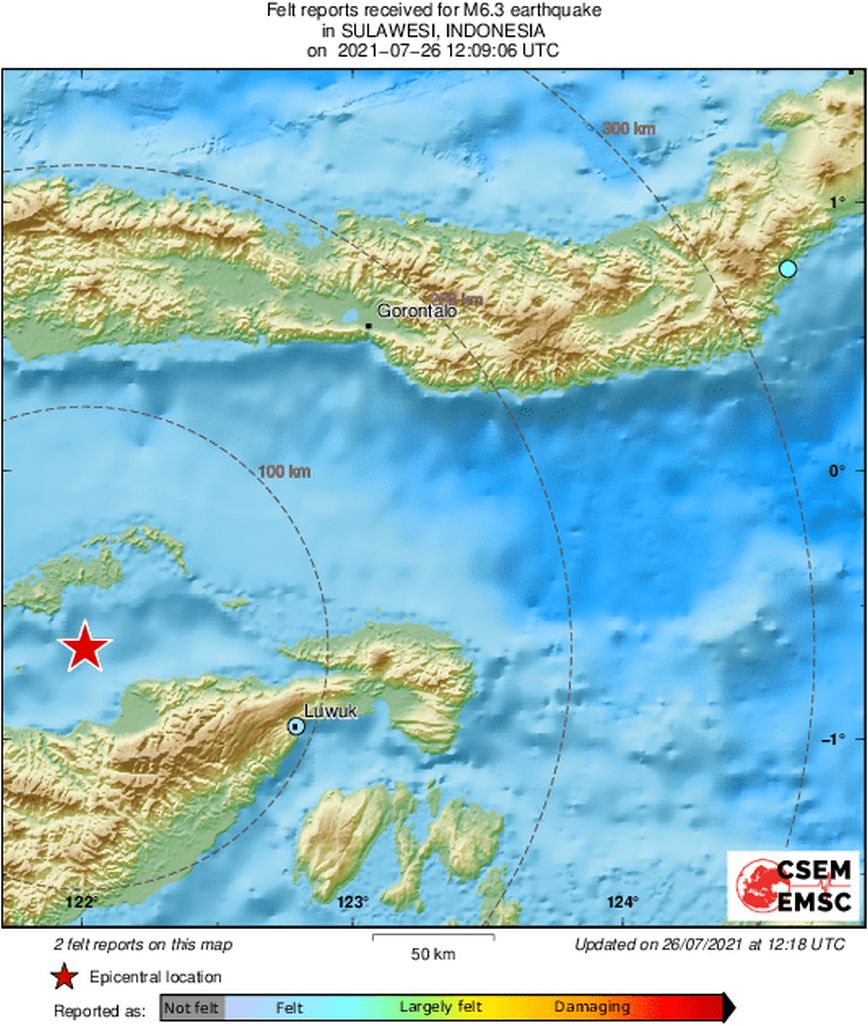 Οι αμερικανικές σεισμολογικές υπηρεσίες αναφέρουν, από την πλευρά τους, πως το μέγεθος του σεισμού ήταν 6,2 και κάνουν λόγο για εστιακό βάθος 10 χιλιομέτρων. Διευκρινίζουν πως δεν εκδόθηκε προειδοποίηση για τσουνάμι. Σύμφωνα με την ίδια πηγή, ο σεισμός σημειώθηκε σε απόσταση περίπου 100 χιλιομέτρων δυτικά της πόλης Λουβούκ, στον κόλπο Τόμινι, στο βόρειο τμήμα της νήσου.