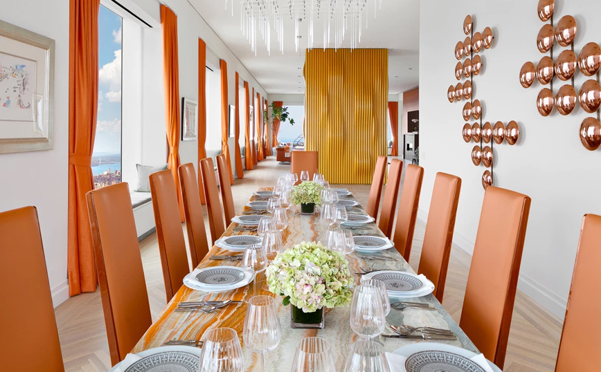 Σχεδιασμένο από τον Rafael Viñoly, το διαμέρισμα πωλείται πλήρως επιπλωμένο. Και τα έπιπλα έχουν εδώ βαριές υπογραφές, μεταξύ αυτών των Hermès και Bentley.