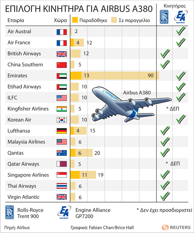 Στο γράφημα που ακολουθεί, μας δίνεται η εικόνα των κινητήρων που έχουν αγοραστεί και που έχουν παραγγελθεί από διάφορες αεροπορικές εταιρείες. Πρώτη σε αγορά και παραγγελίες είναι η εταιρεία Emirates, ενώ ακολουθούν οι Singapore Airlines, η Qantas, η Lufthansa και τέλος η Air France.